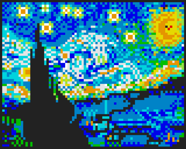 | current | 19:48, 28 July 2023 | 842 × 675 (14 KB) | Stille Willem (talk | contribs) | The 2017 rendition of The Starry Night by Vincent van Gogh. This piece was included in the Windows XP taskbar at the bottom of the canvas, although its window is not included here. |