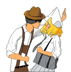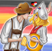 The German boy and Dutch girl characters were a collaborative art piece meant to symbolize the cooperative relationship that the communities of PlaceNL and PlaceDE developed in the course of r/place_2023. It was completed around 18:00 GMT on July 25th, and remained until the Great Whiteout.