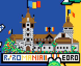 On the second day of the event, it was decided to make a pixel art of the Peleș Castle above the banner with r/Romania written on it. Initially this banner was supposed to have a traditional pattern on it as well, however as work began on the second flag, the empty space was given to r/Buro, which was eventually changed to write "EURO".